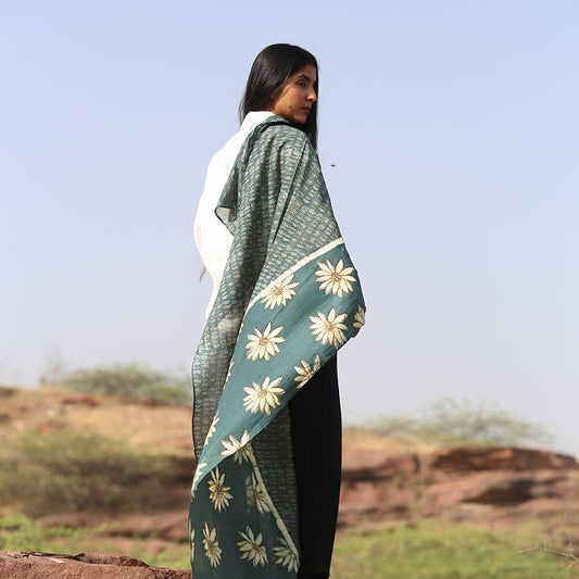 La Joie Handmade Block Print Green Cotton Silk Large Scarf by Ichcha