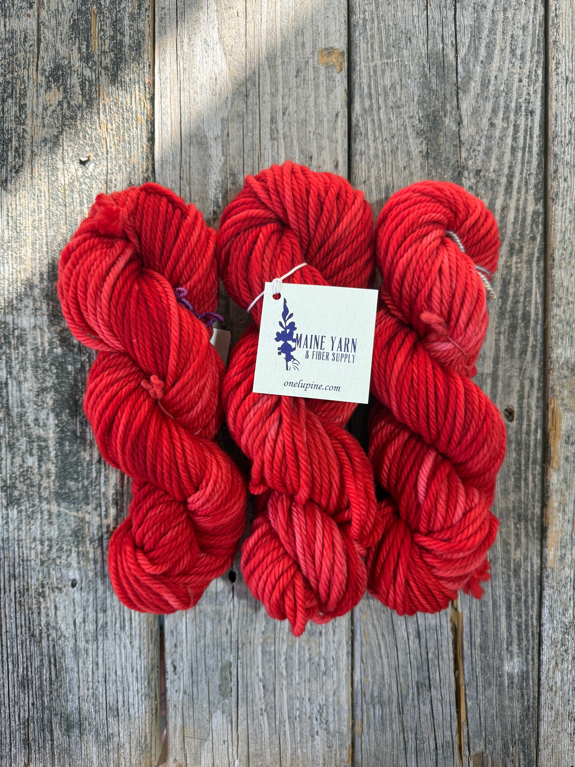 Each skein of Maine Yarn & Fiber Supply yarn is hand-dyed in our Bangor, Maine studio by skilled fiberistas in small batches. So please, expect some minor variations between skeins. For larger projects such as sweaters we suggest a custom dye order. Please contact us for more details.