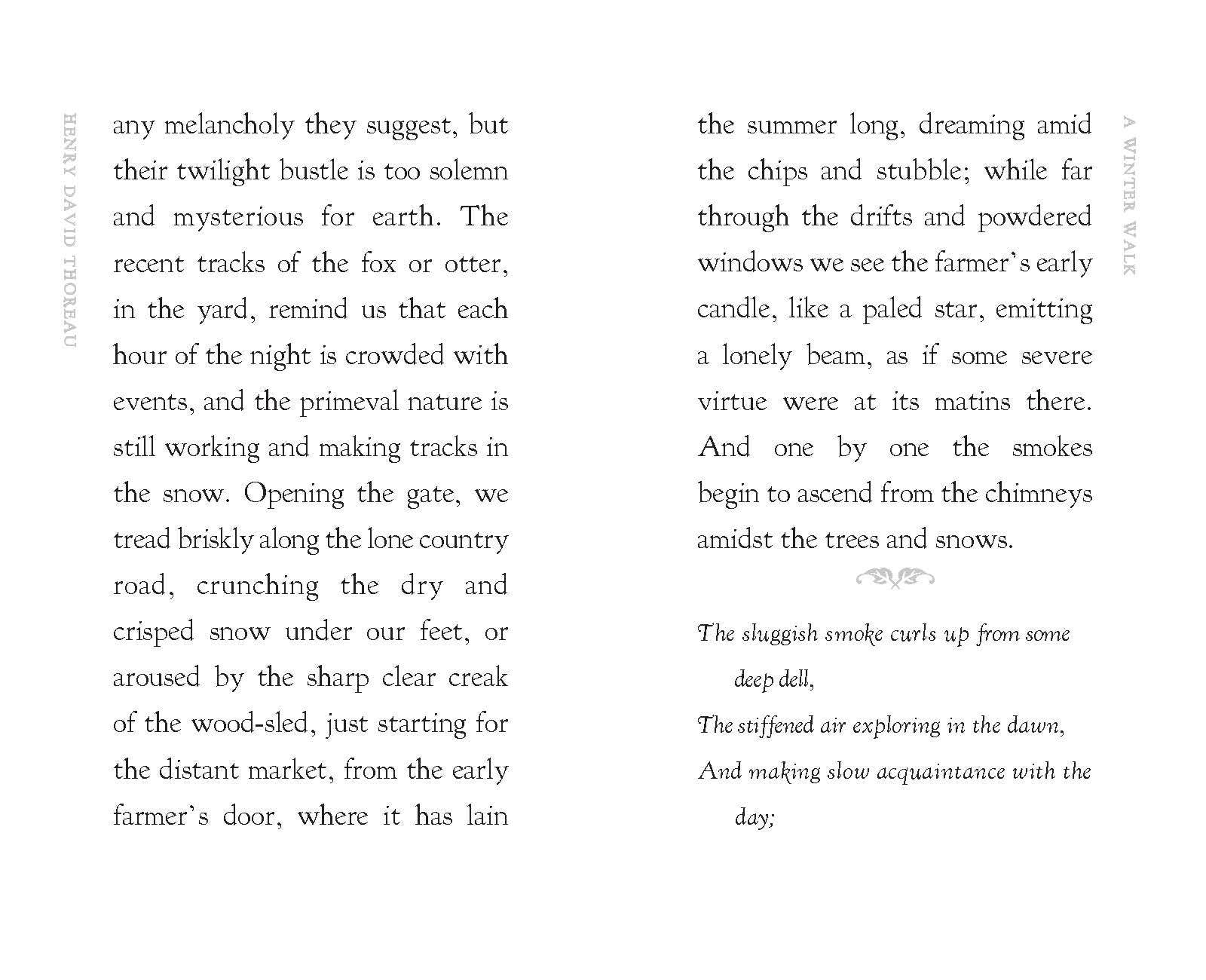 New England transcendentalist Henry David Thoreau's 1843 essay "A Winter Walk" is a loving celebration of winter and walking. Thoreau vividly renders the winter season, writing of its sparkling beauty, its purity, and its stillness, and perfectly describing the warmth, coziness, and cheer to be found back at the home hearth.