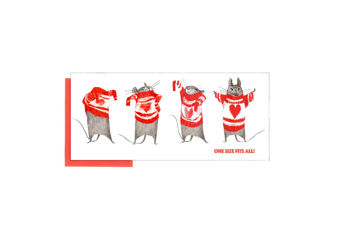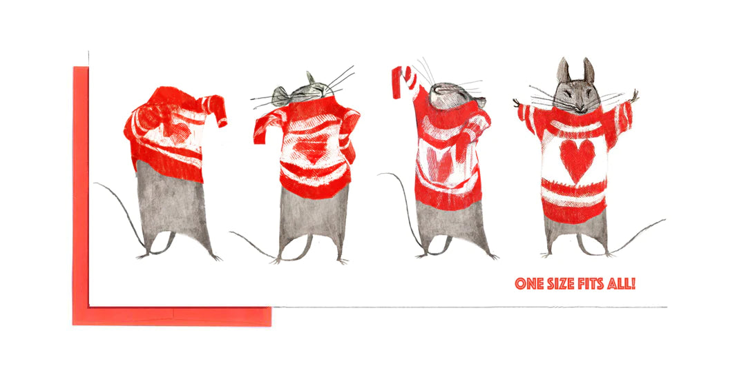 This card is a trifold. Size: 5.5" x 12.75" (unfolded) Inside reads "One Size Fits All" Each of our cards comes with a colorful envelope.