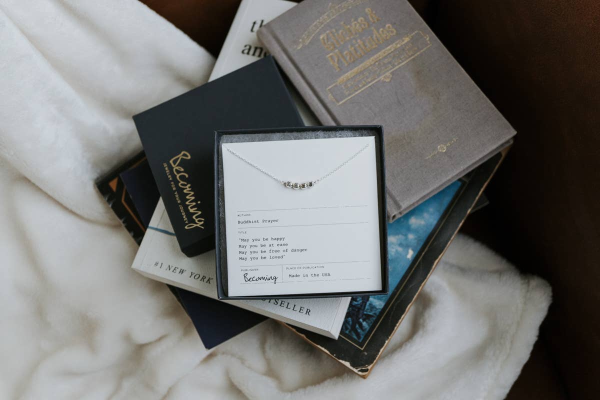 "May you be happy May you be at ease May you be free of danger May you be love" -Buddhist Prayer Charms: Four small faceted beads Charm size: 4mm beads Length: 18" fine cable chain in Sterling silver, Packaging: Message necklace card + jewelry box