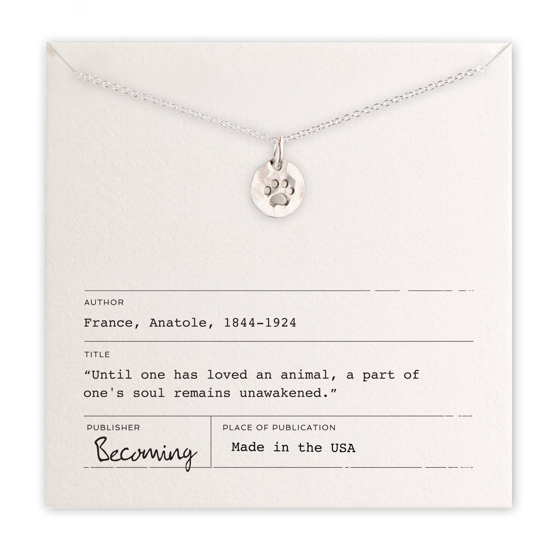 "Until one has loved an animal, a part of one's soul remains unawakened." -Anatole France On charm: Paw print Charm size: 3/8"Length: 18" fine cable chain in Sterling silver Packaging: Message necklace card + jewelry box
