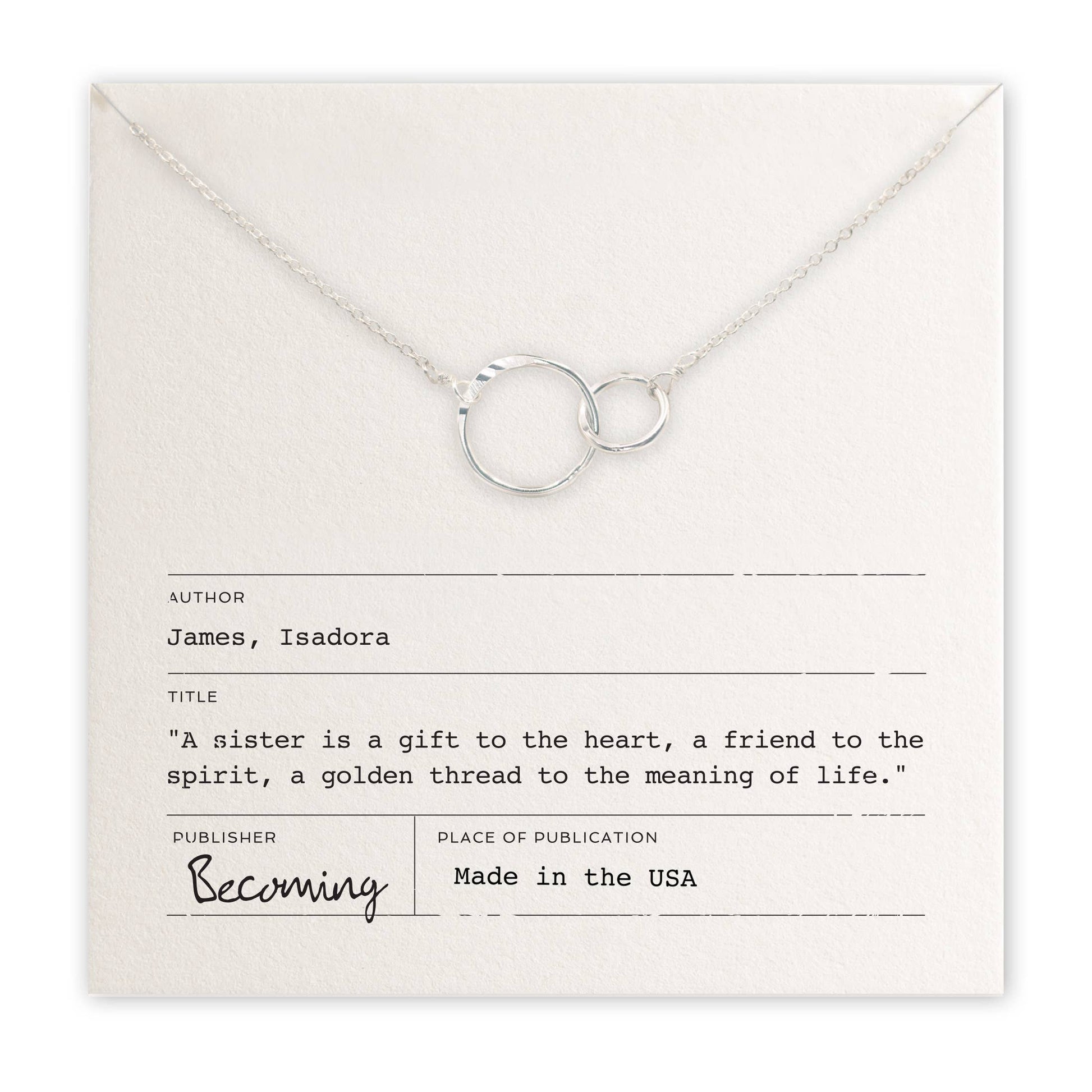 "A sister is a gift to the heart, a friend to the spirit, a golden thread to the meaning of life." -Isadora James Charm: Large and small joined rings Charm size: 1" across Length: 16" fine cable chain in Sterling silver Packaging: Message necklace card + jewelry box
