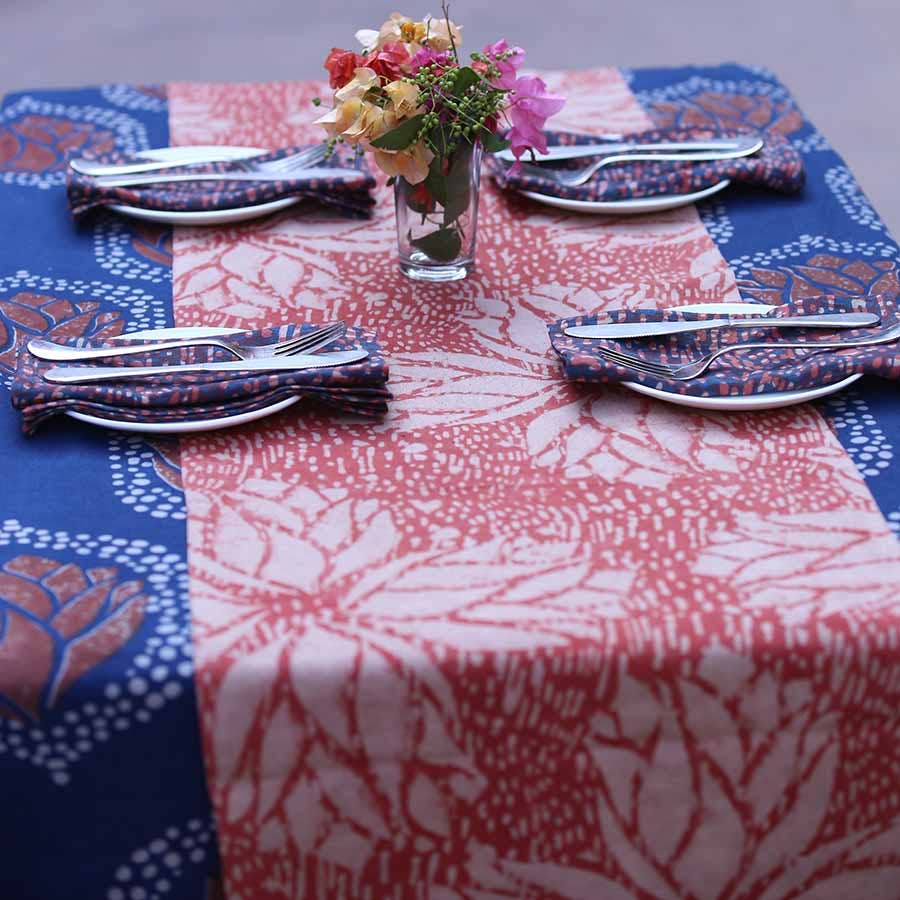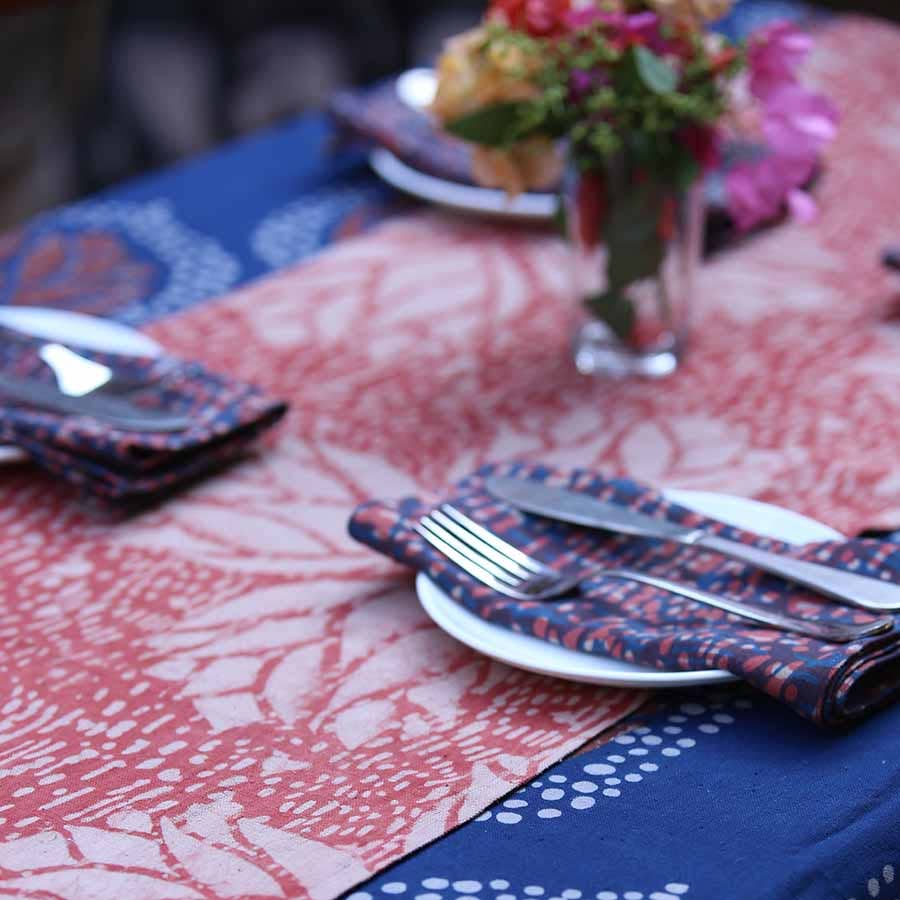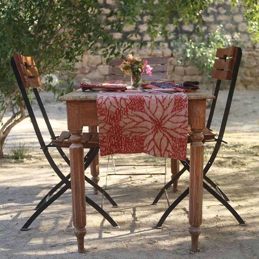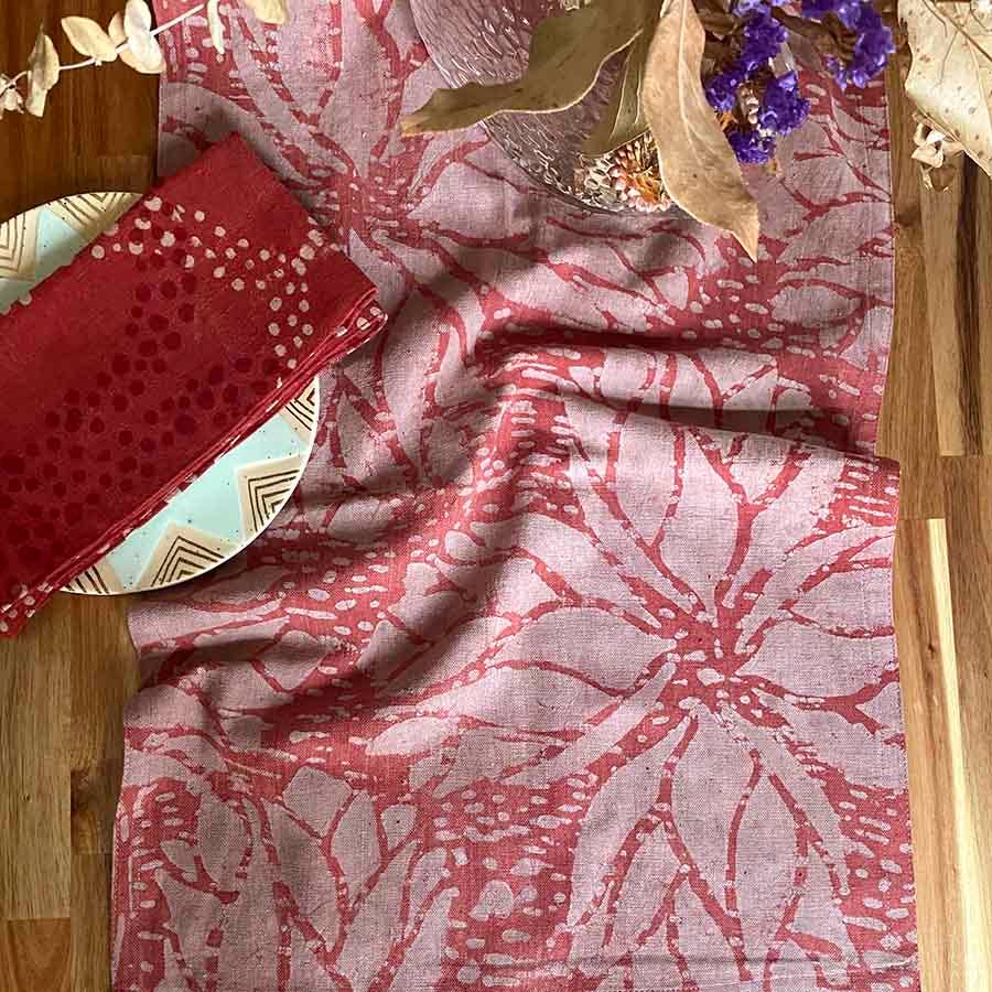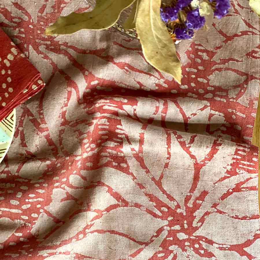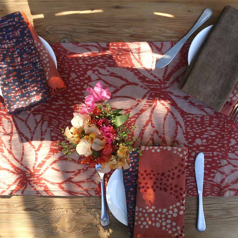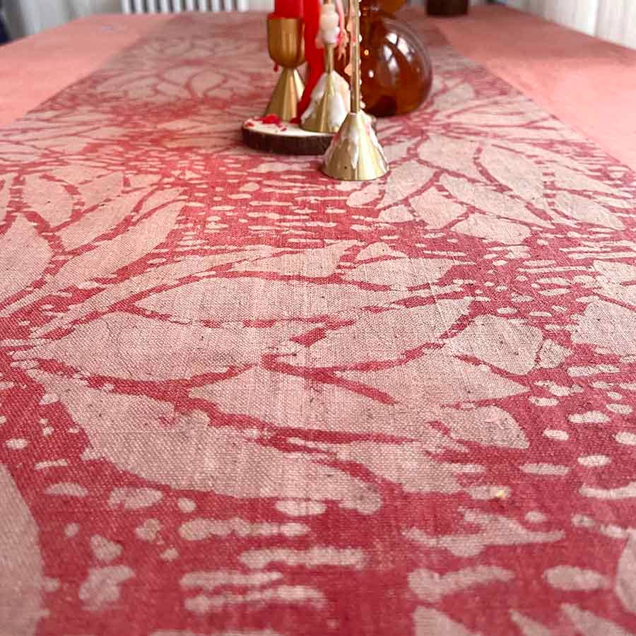 The Rosette runner is inspired by clusters of leaves, creating a silhouette in a evening sun. Perfectly shaped to create a rosette shape. Printed by hand using a carved wooden block on a hand spun and hand woven organic cotton fabric and then hand dyed in natural dyes.