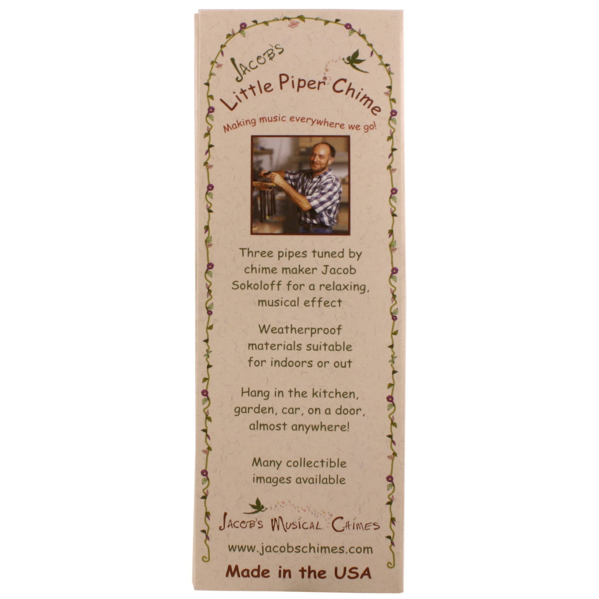 The Little Piper Wind Chime is made with weatherproof materials, so hang it in the kitchen, the garden, the car, in a window -- almost anywhere! The image is cast in metal and finished with antique brass. Proudly made in the USA. We make music wherever we go!