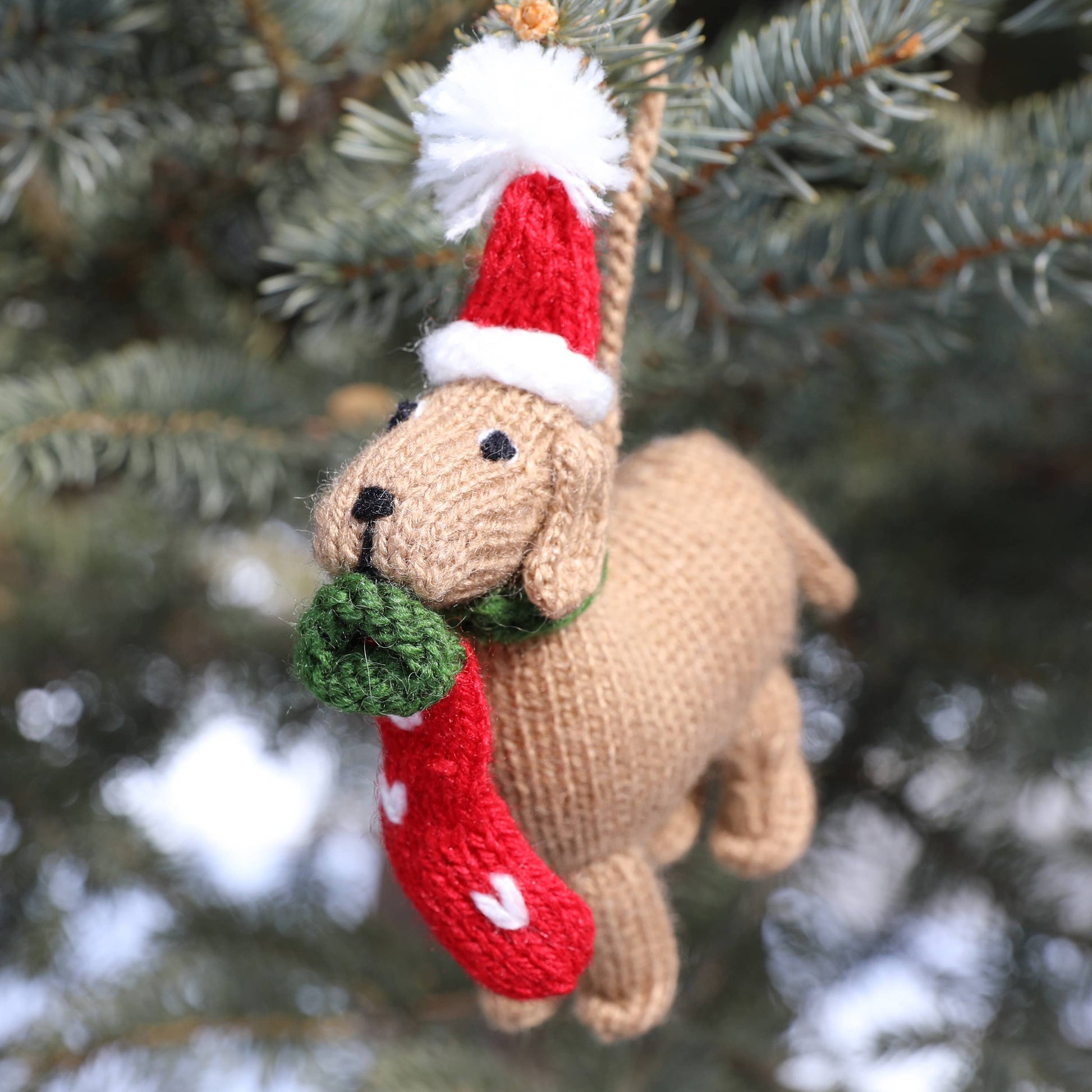 Adorable handcrafted dogs, lovingly dressed in holiday attire. Case pack includes three of each color all wearing cozy Santa hats and holding festive stockings.
