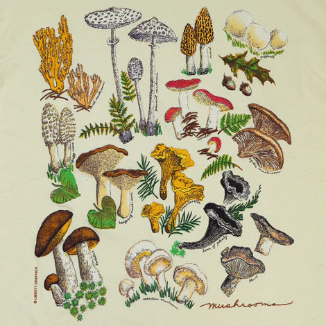 Liberty Graphics presents Mushrooms printed on a 100% cotton heavyweight Adult Natural Long Sleeve t-shirt. Liberty Graphics prints t-shirts using 100% water-based ink for your comfort and our environment. Artist: Ieva Tatarsky.