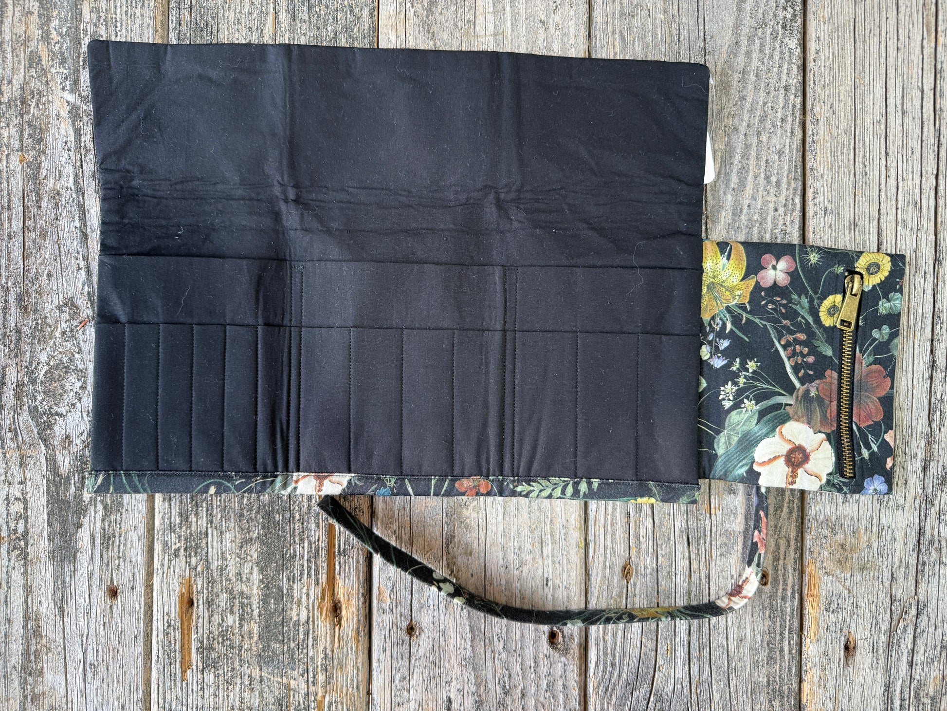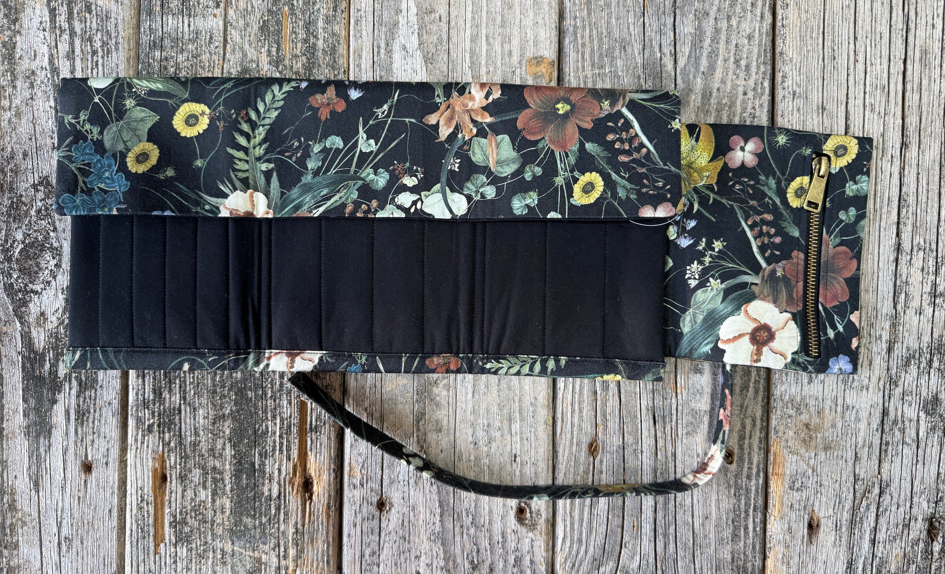 Locally made in Bangor, Maine, this wrap organizer can accommodate all your knitting and crochet tools. Measuring 15” wide and 11” tall when fully opened, it has two rows of pockets - one with three large pockets and another with varying widths of pockets for all your needles and hooks! There’s also a 5” by 6” zippered side pouch for storing extras. Folds up to 5” wide by 7” tall. Made with 100% cotton fabric.