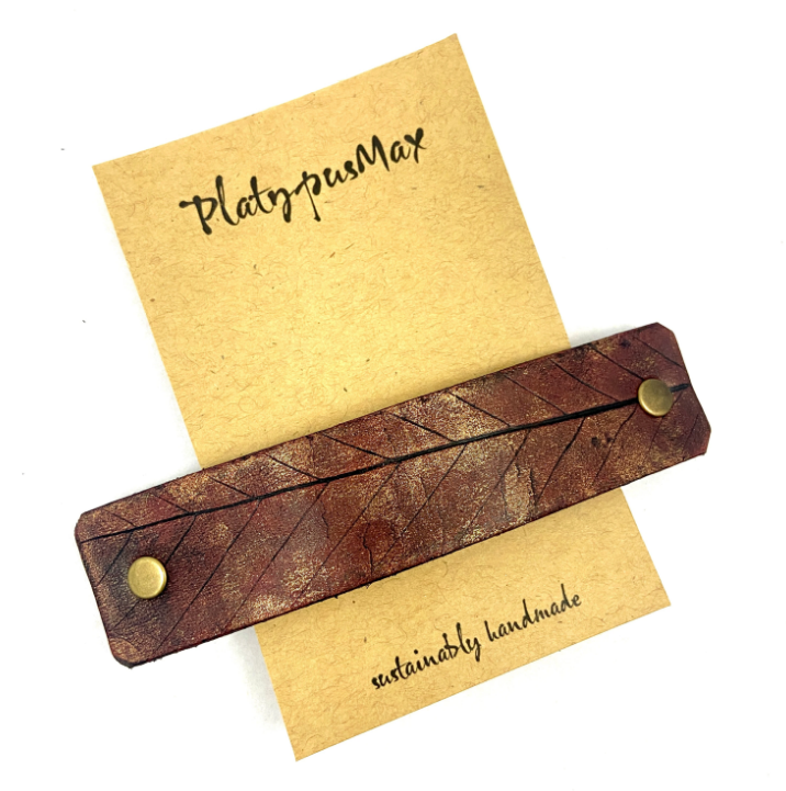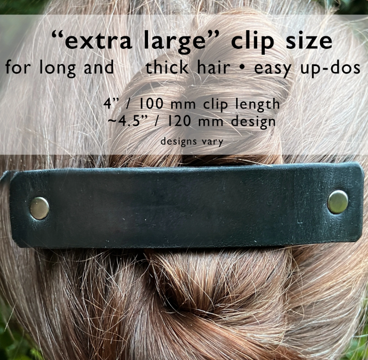 Large recycled leather hair clip barrette with design made from a pressed leaf from the majestic beech tree. Dark brick autumn red with gold highlights over naturally dyed black leather give this hair clip a unique rustic look. Perfect for fall! Yes, a real leaf was pressed into the leather to provide this beautiful texture! Perfect for dress or everyday use. It makes a great gift for anyone with long hair, and nature enthusiasts, and is a nice practical alternative to jewelry. Each barrette I make is handmade and thus one of a kind.