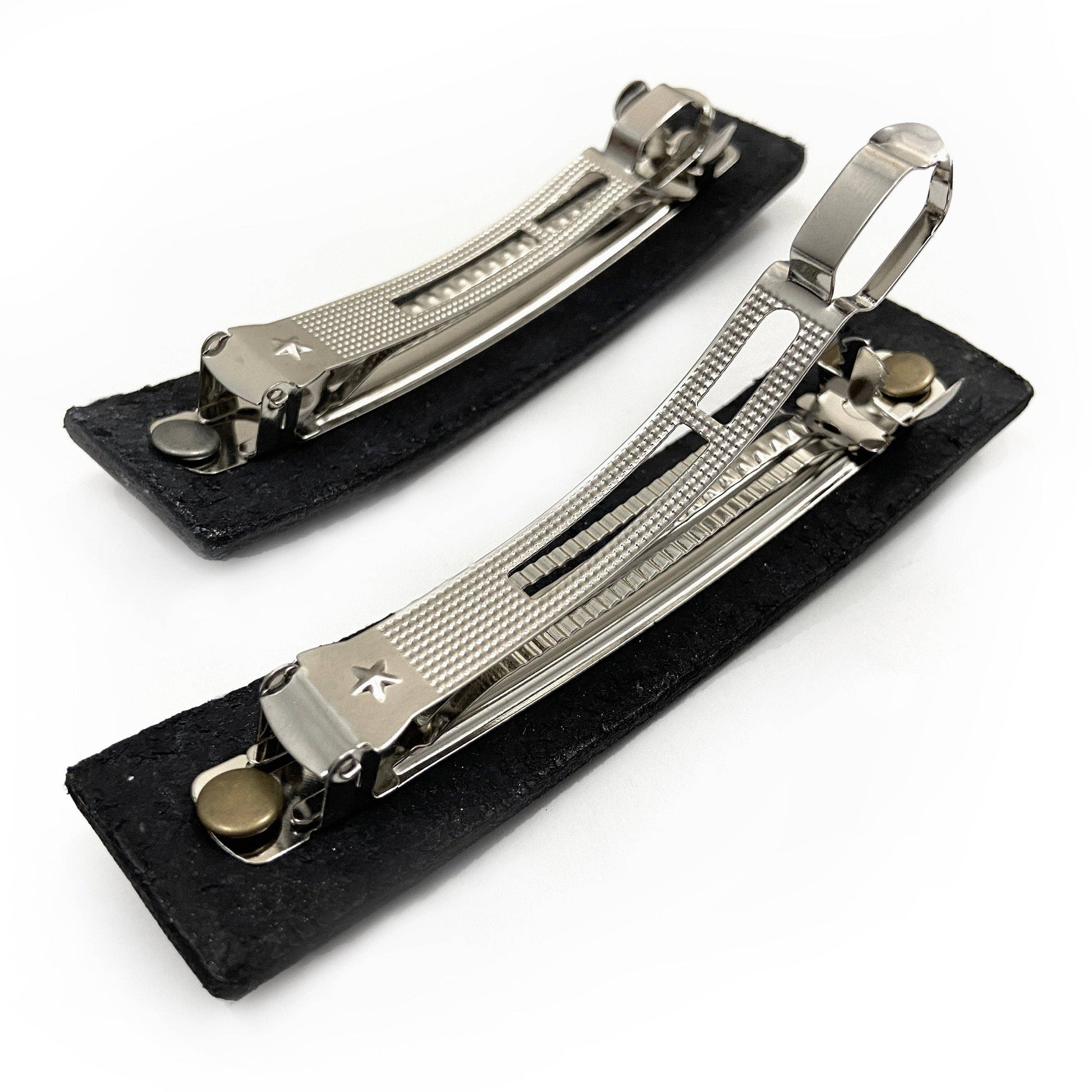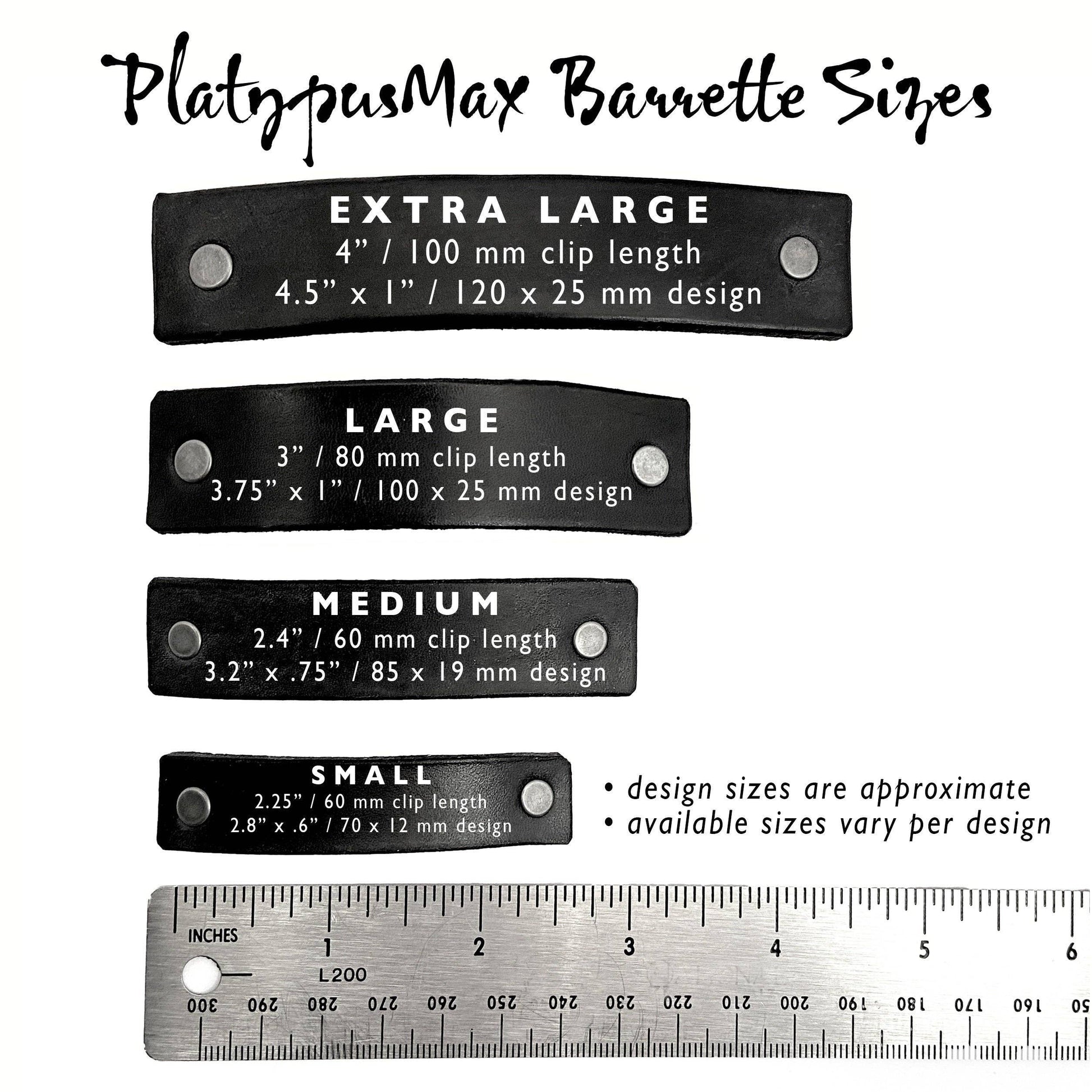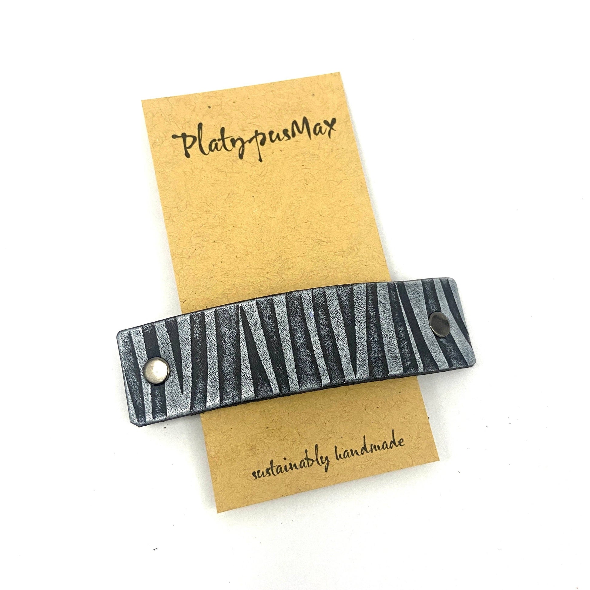 Zebra-like stripes in embossed texture, white on black. Handcrafted from natural biodegradable vegetable tanned leather, and available in 4 different sizes to work with almost any hair type. French style spring tension clip provides strong hold for ponytails, twists, partial updos or everyday messy buns! Clips don't pinch or pull. Makes a great gift for anyone with long hair, as a unique and practical alternative to jewelry.
