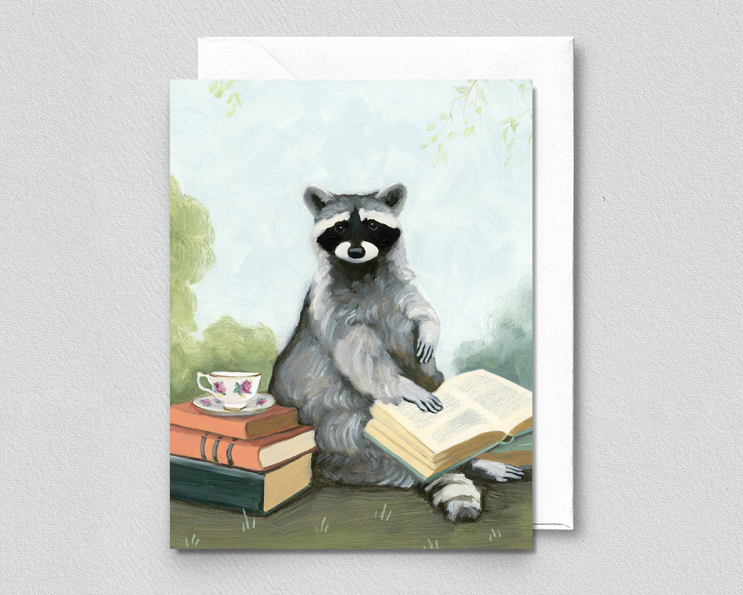 Raccoon with Tea and Books Greeting Card (blank inside) by Kim Ferreira (Joie de Vivre)