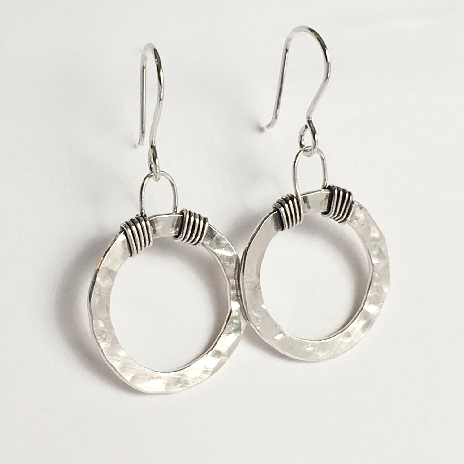 Sterling silver hammered hoop with wirewrap bail. About 1” outer diameter.