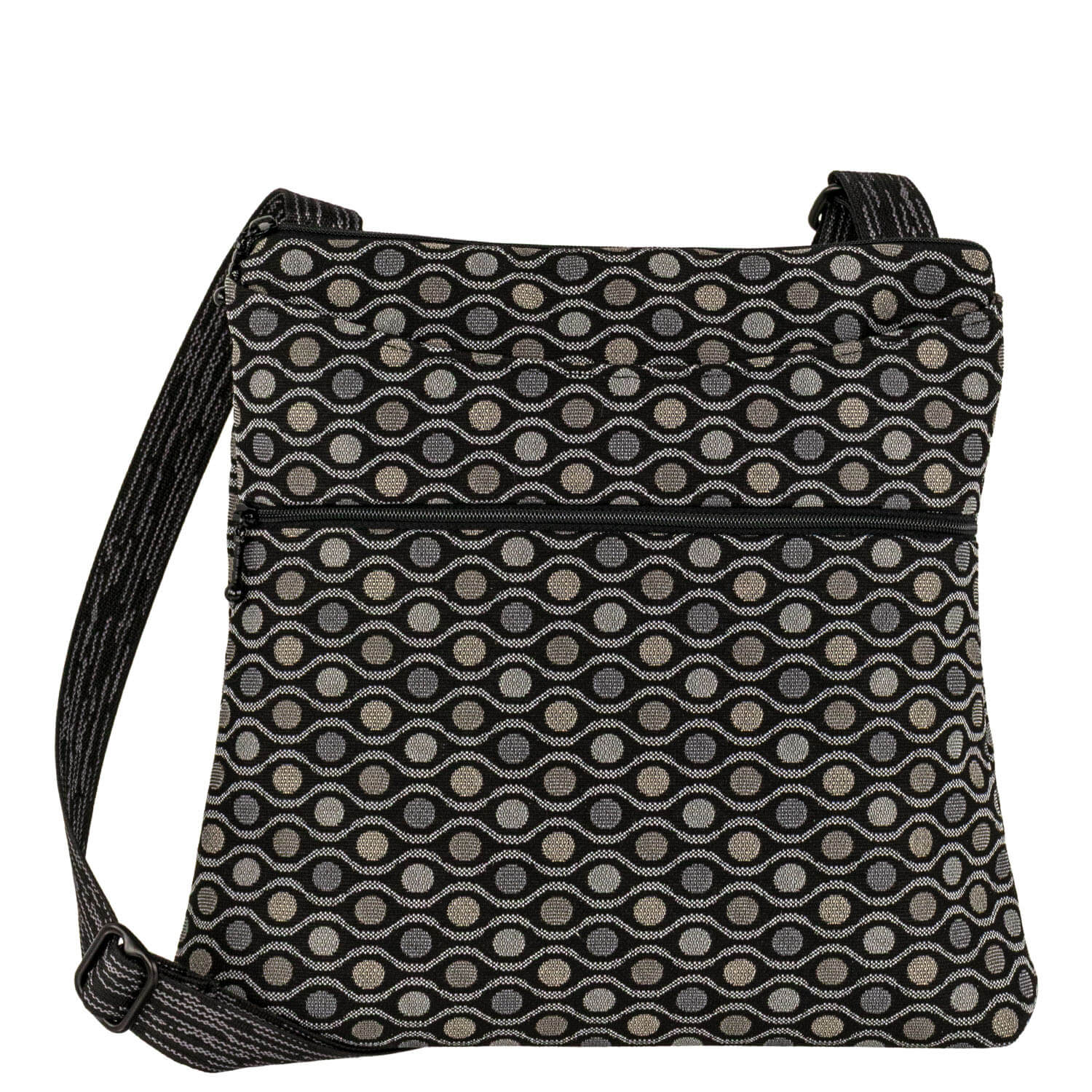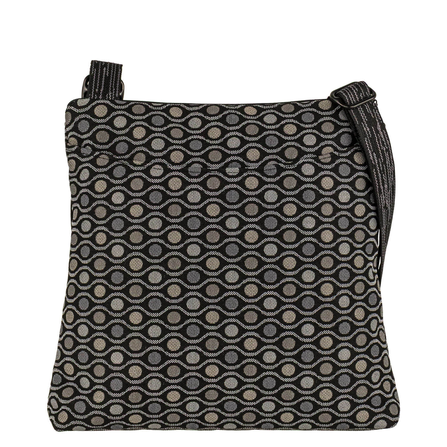 A top favorite! Adjustable 1” web strap. Top zipped main compartment with a generous interior and a small open pocket. Two exterior pockets, one open (6.5 inches deep) for quick access and one zipped. Generous open pocket on the back will hold a water bottle. 2” boxed bottom. It’s a great bag!