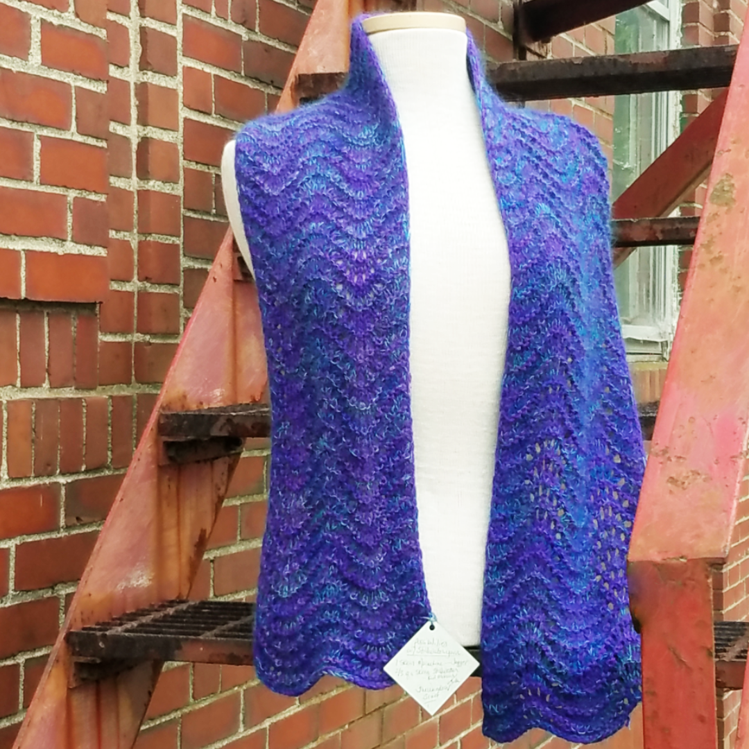 This sweet little scarf marries the classically beautiful Feather & Fan pattern with the wonder of holding our kid mohair/silk lace weight yarn, Stillwater, with a lovely wool sport weight yarn. The result is a beautifully soft, silky, snuggly scarf that is strong enough to go the distance.