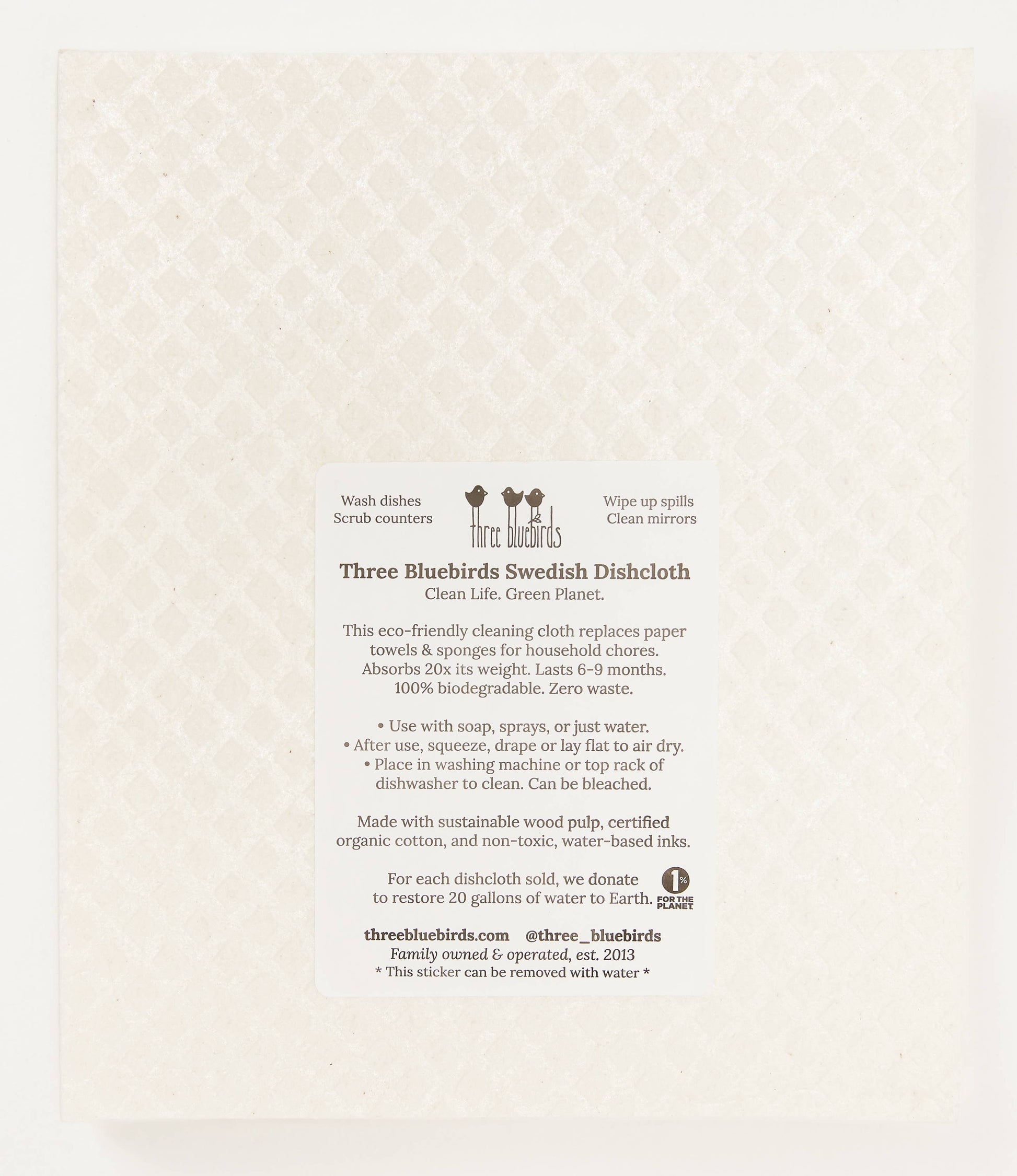 REDUCE WASTE with our Swedish Dishcloth – it’s sustainable, sturdy, and stylish. Each cloth absorbs 20x its weight, replaces 17 rolls of paper towels. ---- CONTENTS: 70% cellulose (FSC-Certified). 30% organic cotton (FairTrade & GOTS). Screen printed with water-based inks. 100% biodegradable. Designed & printed in Connecticut ---- USE: Wash dishes. Wipe up spills. Clean mirrors. Use streak-free on most surfaces. Air dries fast, doesn’t breed bacteria like a sponge. ---- REUSE: Wash up to 200 times, in top rack of dishwasher or in washing machine. Sterilize in microwave or boil briefly. ---- We include one FREE sign with your first order. Our hand made pine wooden display box holds 75 pieces and fits this sign. Box available on our product page for $29 (see image #2). ---- We donate 1% of revenue to the Earth for each dishcloth purchased, as a “1% for the Planet” business. CLEAN LIFE. GREEN PLANET. MADE WITH LOVE.