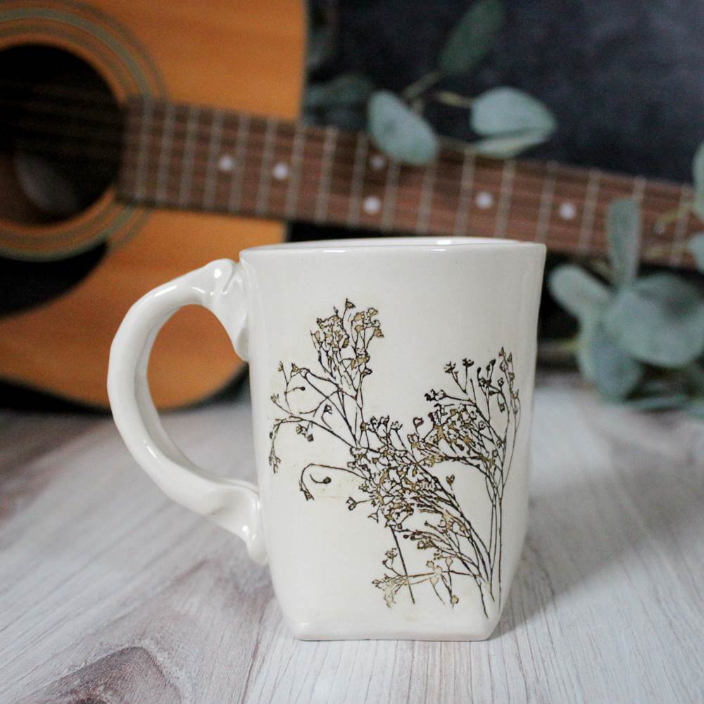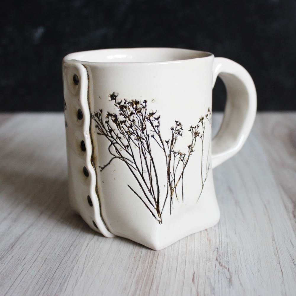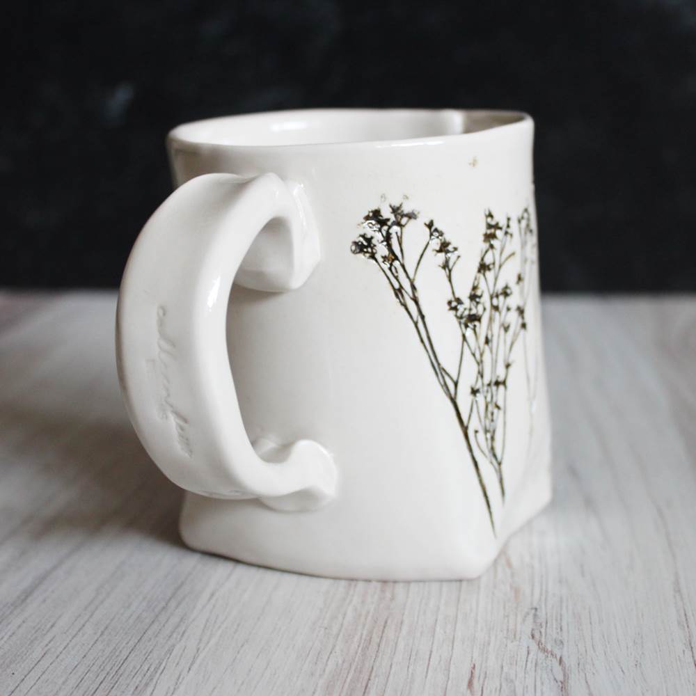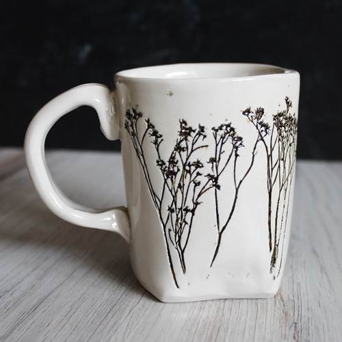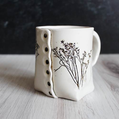 Each mug you see on this page starts as a hand built stoneware slab that is pressed with a one of a kind hand drawn stamps, real dried wild flowers, and/or real antique lace. They are then rubbed with stains to make the impressions pop and dipped in hand mixed glazes. Each one is high fired in rural WI out of my in home studio.
