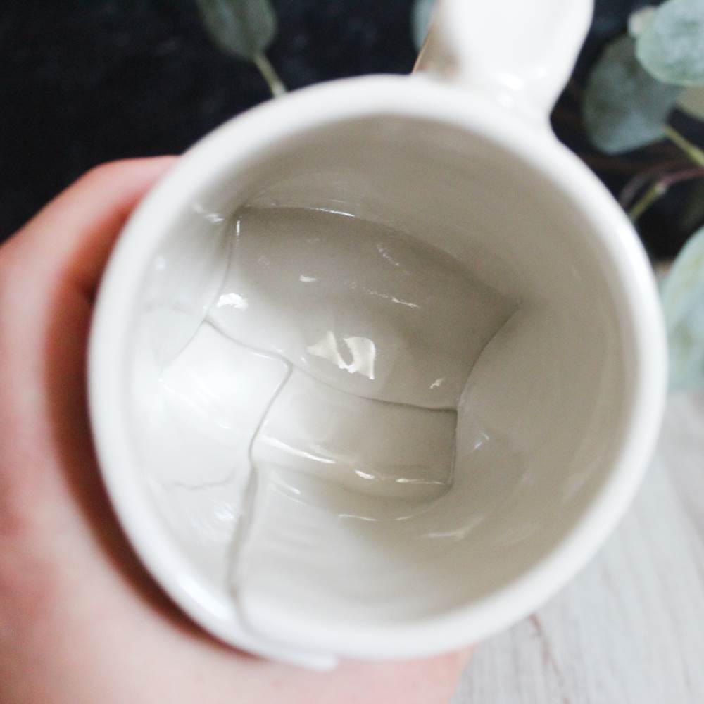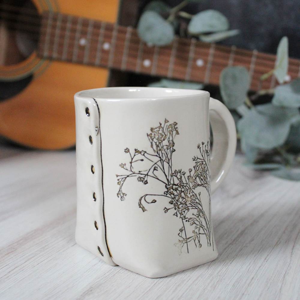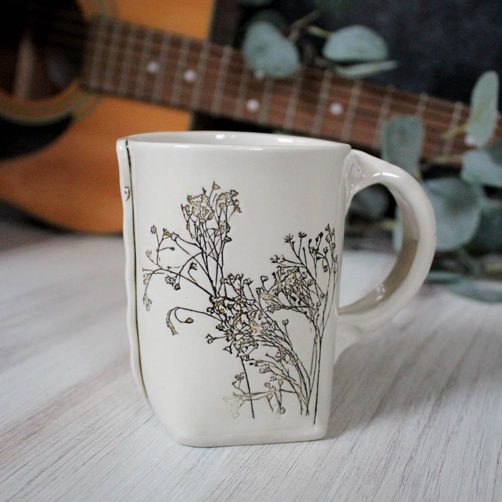 Each mug you see on this page starts as a hand built stoneware slab that is pressed with a one of a kind hand drawn stamps, real dried wild flowers, and/or real antique lace. They are then rubbed with stains to make the impressions pop and dipped in hand mixed glazes. Each one is high fired in rural WI out of my in home studio.