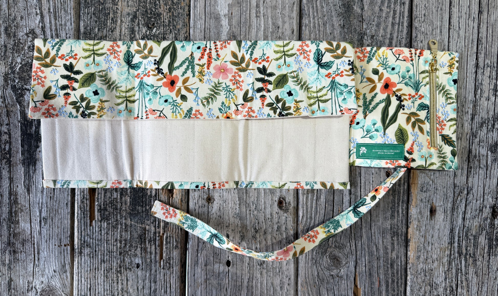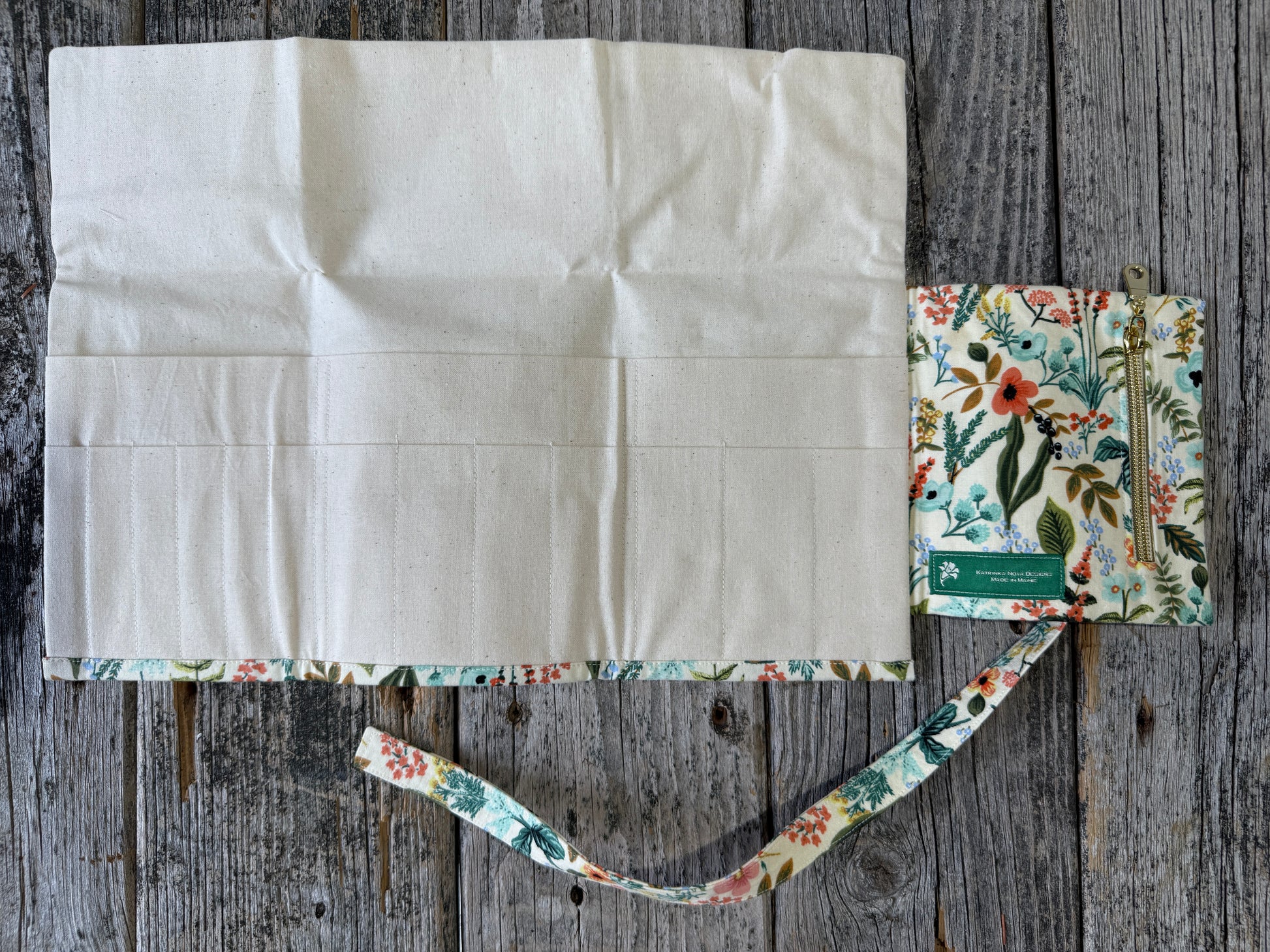 Locally made in Bangor, Maine, this wrap organizer can accommodate all your knitting and crochet tools. Measuring 14.5” wide and 11” tall when fully opened, it has two rows of pockets - one with three large pockets and another with varying widths of pockets for all your needles and hooks! There’s also a 5” by 6” zippered side pouch for storing extras. Folds up to 5” wide by 7” tall. Made with 100% cotton fabric.