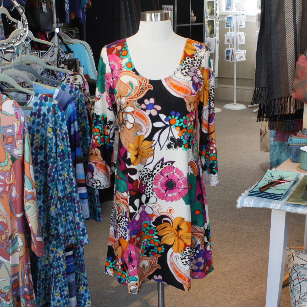 Women's print loose fit tunic/mini dress is made for comfort and style. 3/4 fitted sleeve, scoop neck, falls 34.5" from shoulder to hem.
